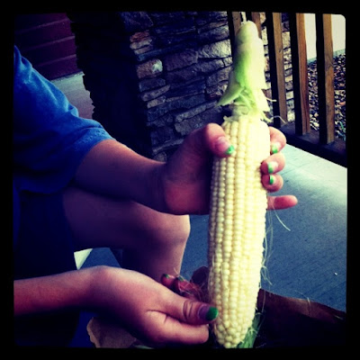 The corn here is DELISH!! For reals. We live around the corner from the Karcher Farmer’s Market. They sell unbelievable corn, fruit, veggies, dime store candies, and cinnamon rolls. So. Happy.